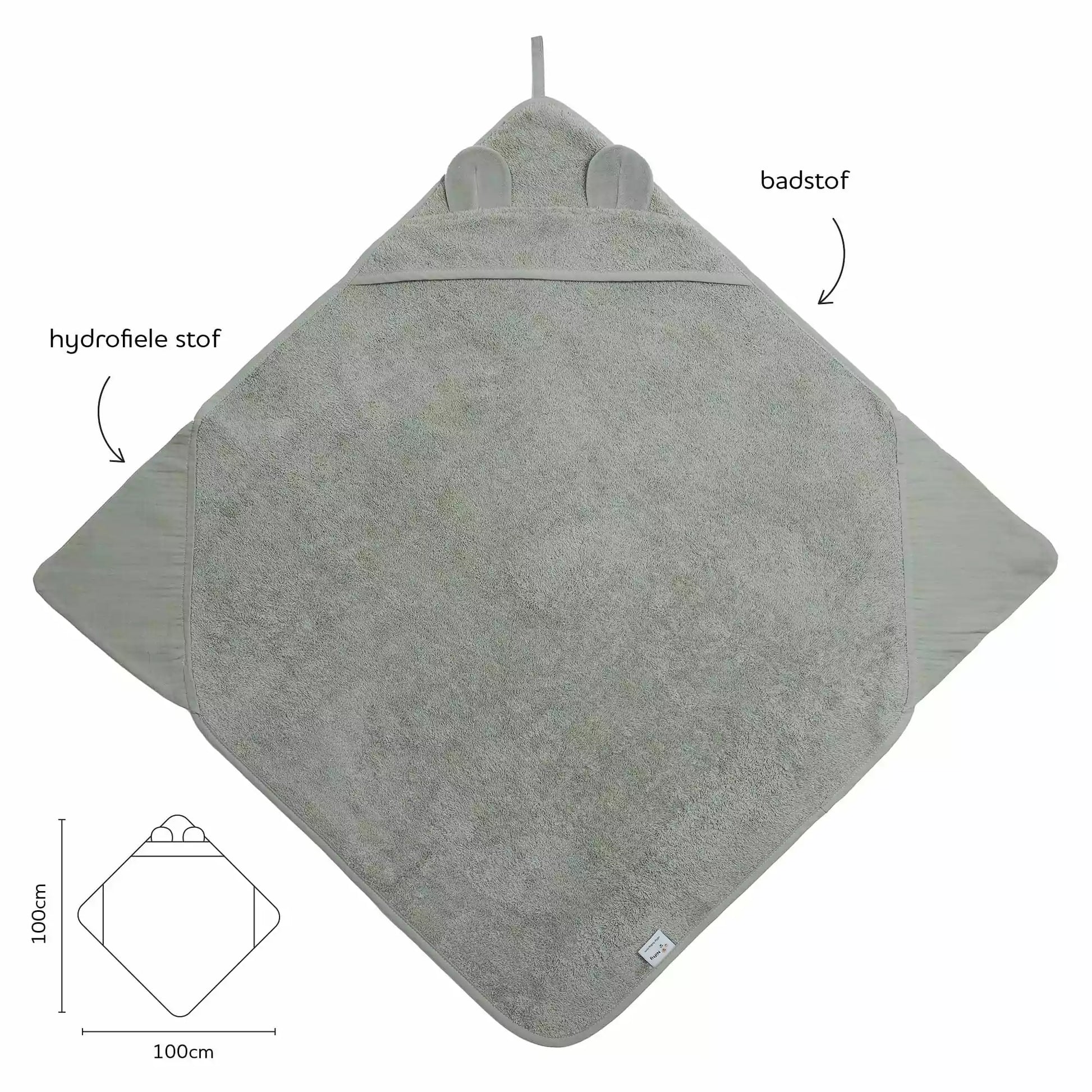 Warme badstof gecombineerd met zachte hydrofiele stof. Hiermee blijft je baby na het badderen lekker warm en kun je de huid tussen de huidplooitjes goed droogmaken. Met name ideaal bij het afdrogen van je baby op het aankleedkussen.