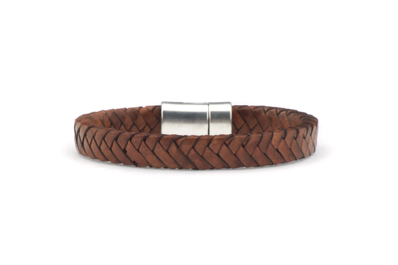 Een leren armband welke bestaat uit een mooie vlecht met pijlmotief en een zilverkleurige, hoogwaardige, nikkelvrije magneetsluiting. De armband is ongeveer 10mm breed.