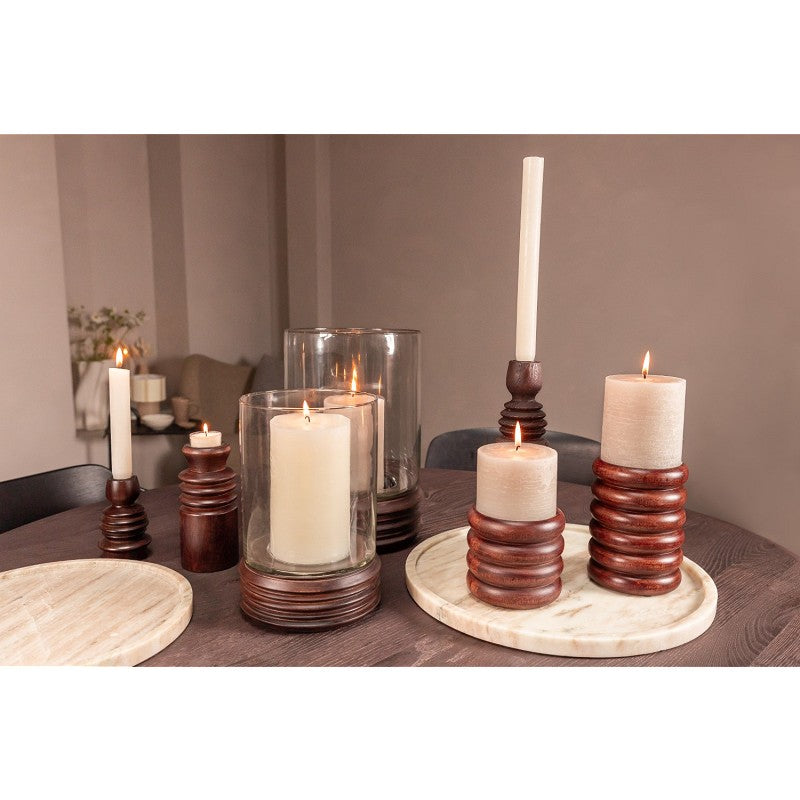 Voeg een elegantie toe aan je interieur met deze prachtige kandelaars, speciaal ontworpen voor stompkaarsen tot max 9 cm. Gemaakt van hoogwaardig donker hout en voorzien van een subtiel geribbeld ontwerp, passen deze kandelaars gemakkelijk in elke woonstijl, van modern tot klassiek.