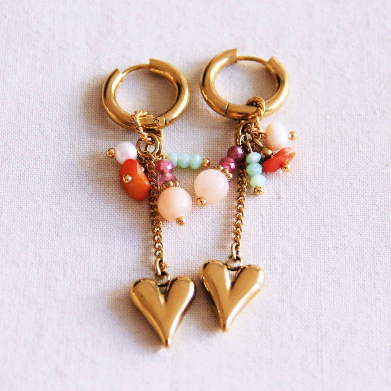 Vrolijk, speels en met een romantische touch! Deze gouden oorringen zijn versierd met een kleurrijk trosje van echte edelsteentjes en een charmant hangend hartje. De perfecte mix van boho en chic – ideaal om elke outfit nét dat beetje extra te geven.