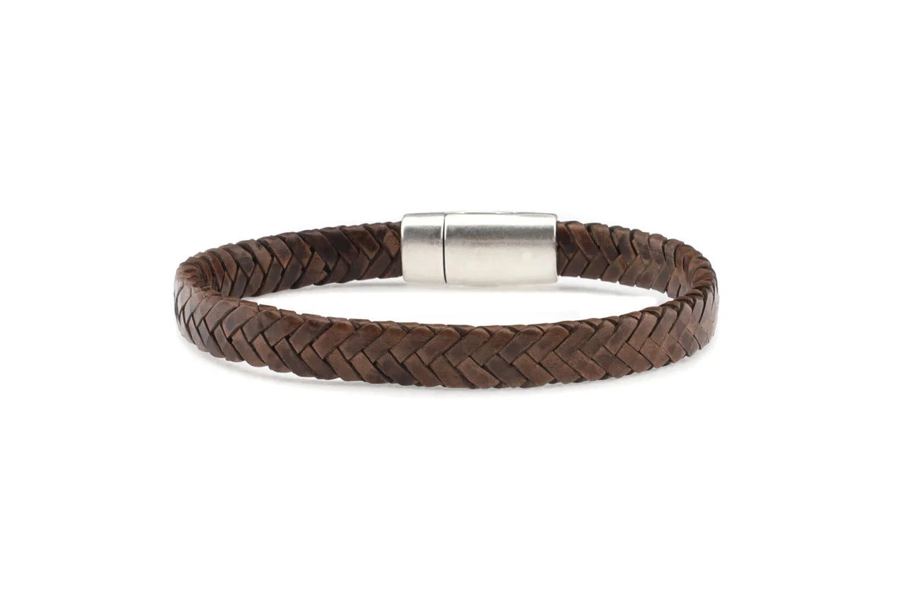 Een smalle gevlochten leren armband voorzien van een zilverkleurige, hoogwaardige, nikkelvrije magneetsluiting. De vlecht is ongeveer 1 cm breed.