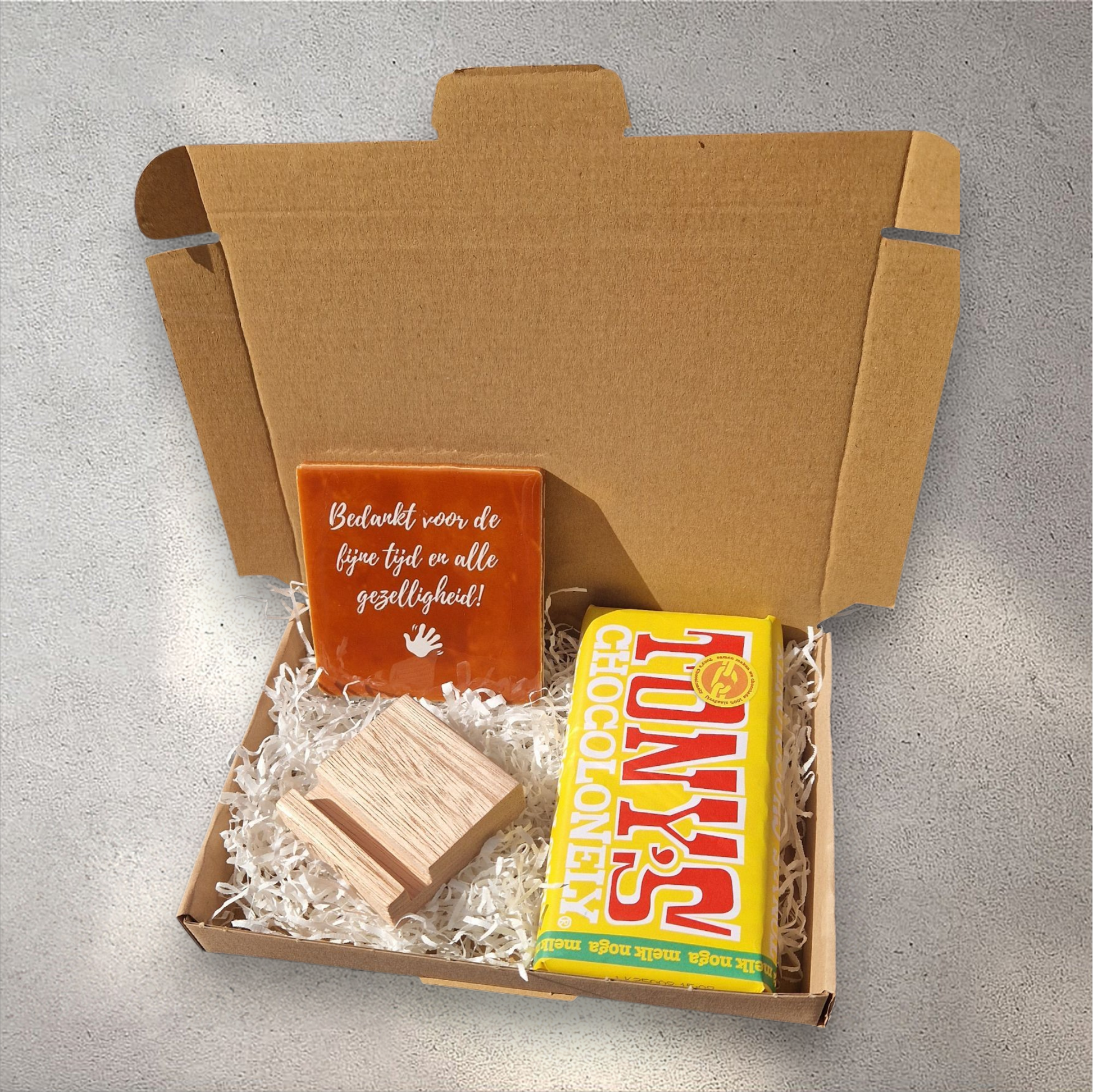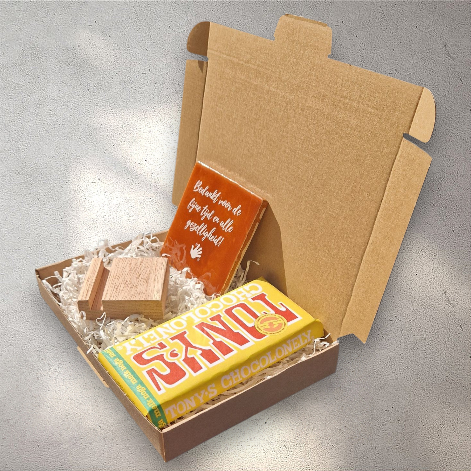Het pakket bevat een tegeltje met houten houder, dat een mooie herinnering achterlaat, en een stukje Tony’s Chocolonely voor een zoete traktatie.