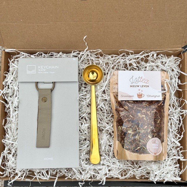 In dit pakket vind je een lederen sleutelhanger met de tekst 'Home' – een prachtig symbool voor thuiskomen en warmte. Daarbij zit een handige theeklem/maatlepel , ideaal om een perfect kopje losse thee te zetten. Het geheel wordt compleet gemaakt met een zakje thee 'Nieuw Leven' , een accuraatle en frisse blend die symbool staat voor een nieuw begin en momenten van roest.
