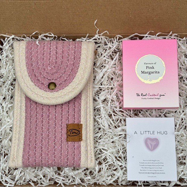 Het pakket bevat een telefoontasje / klein tasje, handig voor dagelijks gebruik en stijlvol tegelijk. Daarnaast zitten er Vinoos Winegums in met cocktailsmaak, verkrijgbaar in 3 verschillende varianten, voor een vrolijke en smaakvolle verrassing. Om het compleet te maken, is er een kaartje met een rozenquartz hartje en de tekst “Little Hug”, een klein, betekenisvol gebaar dat warmte en aandacht uitstraalt.