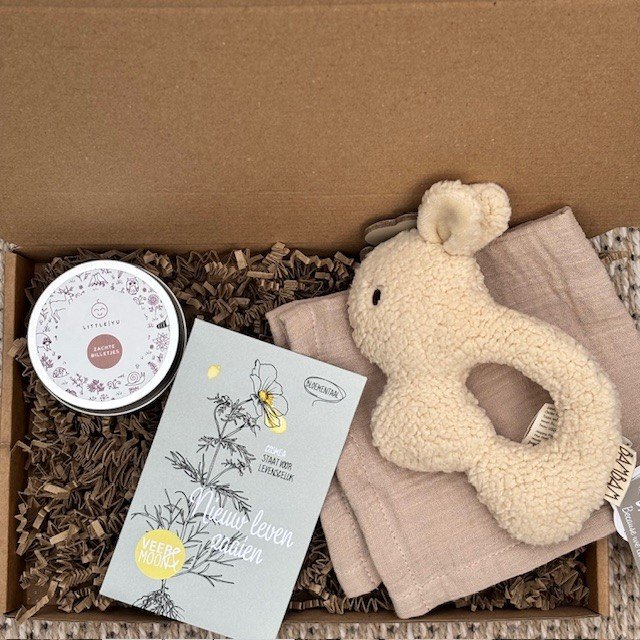 Het pakket bevat een zacht pluche rammelaar konijn, heerlijk om mee te spelen, een spuugdoekje voor dagelijkse praktische momenten. Van het fijne merk Little Yu de creme zacht en verzorgend voor de tere babyhuid. Als symbolisch extraatje zit er een zakje ‘Nieuw Leven Zaaien’ met bloemzaadjes bij, een mooie herinnering die letterlijk iets moois laat groeien.