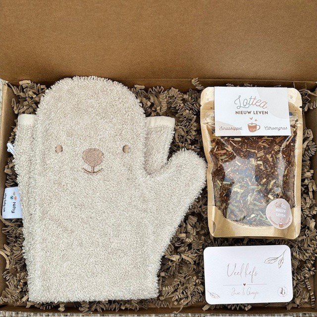 Het pakket bevat een speciale douchehandschoen voor optimale grip onder de douche, ideaal om veilig en ontspannen met je baby te douchen. Daarnaast zit er een zak thee “Nieuw Leven” bij. Om even te genieten en stil te blijven staan bij dat mooie nieuwe leventje.