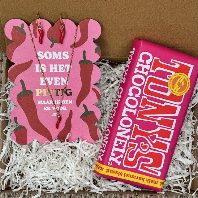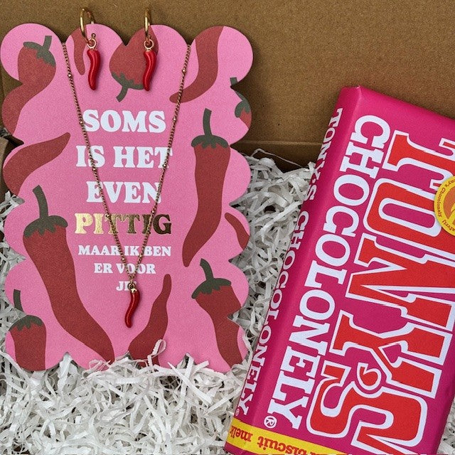 Wil je iemand op een originele en lieve manier verrassen? Kies dan voor het brievenbuspakket met de “Pittig” sieradenset én een heerlijke Tony’s Chocolonely-reep.
