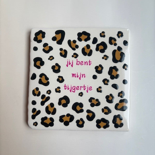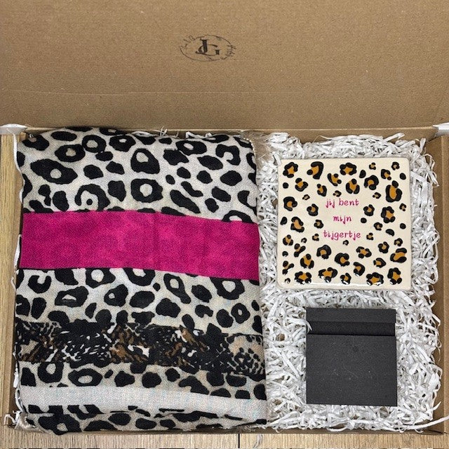 In dit pakket vind je een stijlvolle sjaal met panterprint – zacht, licht en altijd een eyecatcher. Daarnaast zit er een tegeltje met de tekst “Jij bent mijn tijgertje”, inclusief een houten standaard zodat het meteen een mooi plekje kan krijgen. Humor en warmte komen hier samen in een origineel en liefdevol geschenk.