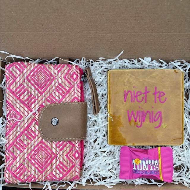 In dit pakket vind je het stijlvolle portemonneetje Ushuaia, compact en handig voor dagelijks gebruik. Daarbij een tegeltje met de tekst “Niet te Wijnig”, perfect voor de liefhebber van een goed glas en een knipoog naar het leven. Het tegeltje kan eenvoudig neergezet worden en geeft ieder interieur direct een vleugje humor.