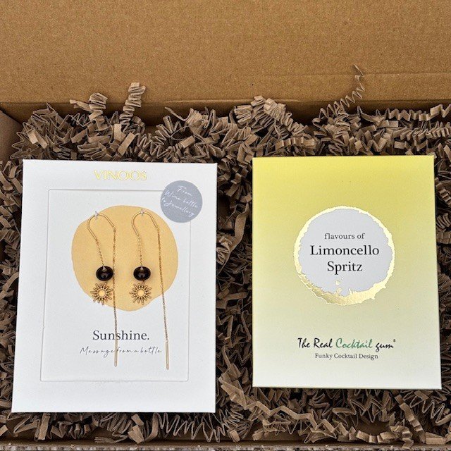 Het bevat prachtige oorbellen van Vinoos, met stenen gemaakt van gerecyclede wijnflessen – een duurzaam en stijlvol accessoire dat bij elke outfit past. Daarnaast zitten er Winegums in met cocktail-smaak (te kiezen uit drie smaken) , de nieuwste trend in zoetigheid, voor een vrolijke en smaakvolle verrassing. Dit pakket is een compleet en stijlvol cadeautje dat iedere vrouw blij maakt, ongeacht de gelegenheid.