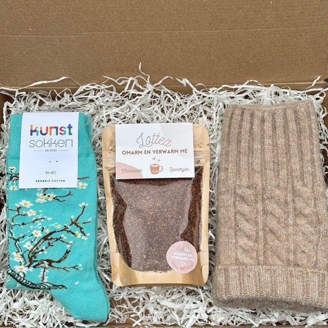 Geniet van een heerlijke kop thee “Omarm me & verwarm me”, een unieke blend met chocolade en specerijen die je direct een cosy gevoel geeft. Combineer dat met de zachte vingerloze handschoenen met kabelreliëf, gemaakt van een warme mix van 80% acryl en 20% wol – praktisch, stijlvol én comfortabel. Voor een vrolijke finishing touch bevat dit pakket ook een paar kunstsokken met een prachtige Japanse bloesemprint, waarmee je outfit net dat beetje extra krijgt.