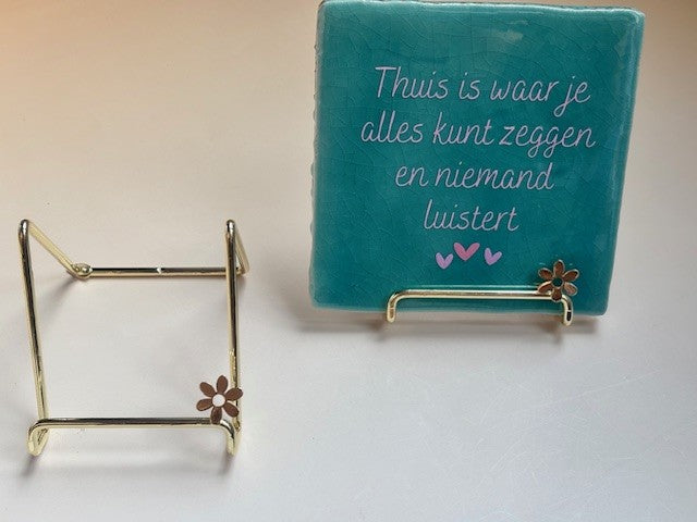 Met dit lieve gouden tegeltjeshouder inclusief bloemetje staat uw spreukentegel overal mooi!