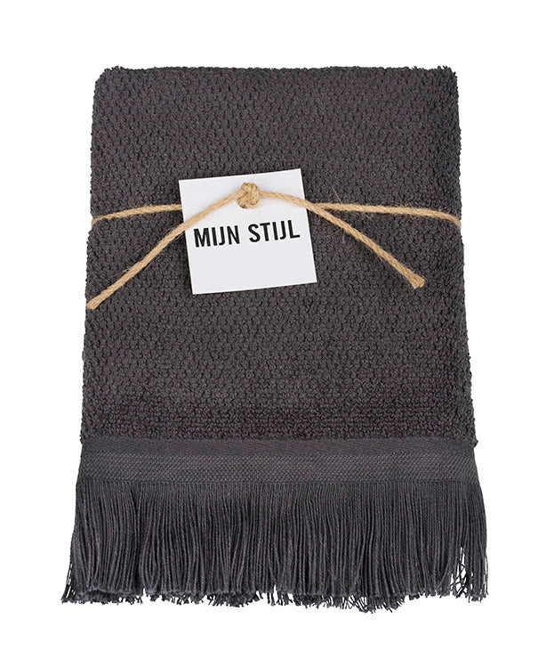 Deze stijlvolle donkergrijze keukendoek met franjes met een afmeting van 40x60 cm, is een perfecte toevoeging aan elke keuken. Gemaakt van 100% katoen waardoor ze zowel zacht aanvoelen als duurzaam zijn. Door de neutrale kleur en de elegante franjes past deze handdoek in elk interieur.