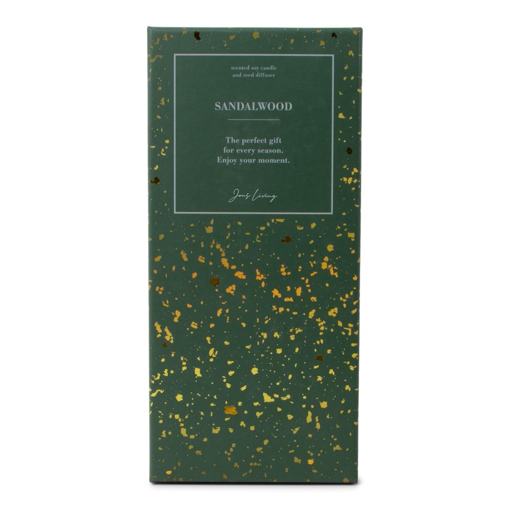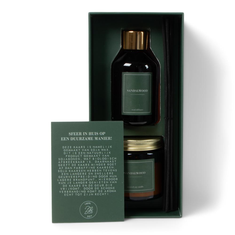 Deze luxe giftbox is gevuld met een geurkaars, diffuser en geurstokjes. De set geeft een subtiele sandalwood geur af. De kaars is gemaakt van soja wax. Dit is een natuurlijk product gemaakt van sojabonen. Door het gebruik van soja wax komt er minder roet vrij. Ook heeft de kaars een langere en snellere geurverspreiding. De brandduur van de kaars is ca. 12-15 uur.
