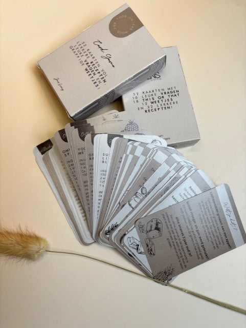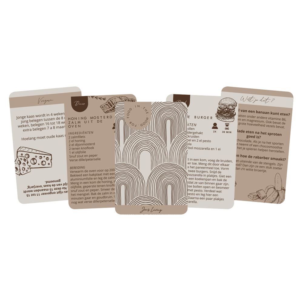 Duik de keuken in, want met het In The Mood For Food kaart"spel" begin je gelijk te watertanden. De set bestaat in totaal uit 52 kaarten vol lekkere recepten, leuke vragen en grappige weetjes over eten. Leuk om te combineren met ons mooie receptenboek.