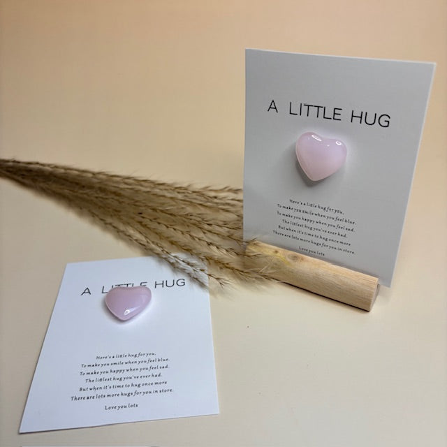 De kaart zelf heeft een rustige, elegante uitstraling met een eenvoudige maar mooie lay-out. Bovenaan staat een inspirerende tekst, a little hug, in een stijlvolle en goed leesbare lettertype. De tekst heeft een bemoedigende toon, die een gevoel van steun en zorg uitdrukt.